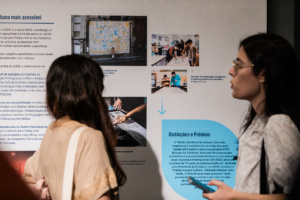 – mesa com réplica táctil de um mural e código QR que permite o acesso a audiodescrição, interpretação em LGP, versões em linguagem clara e comunicação alternativa e aumentativa.